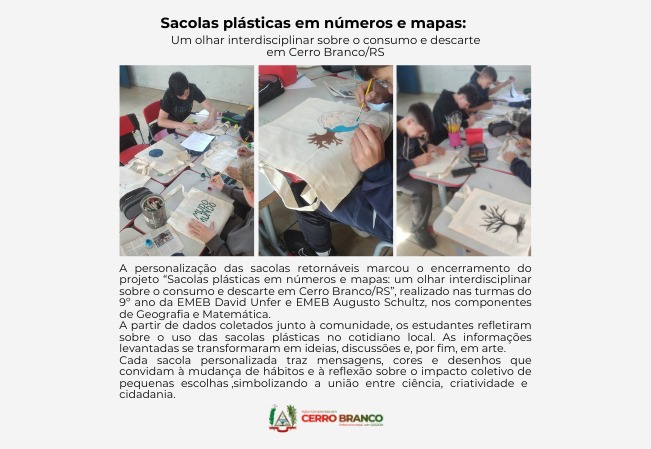 Cerro Branco concluiu uma importante etapa do projeto "Sacolas plásticas em números e mapas: Um olhar interdisciplinar sobre o consumo e descarte em Cerro Branco/RS". O encerramento foi marcado pela personalização de sacolas retornáveis, transformando dados e reflexões em arte e mensagens de conscientização.