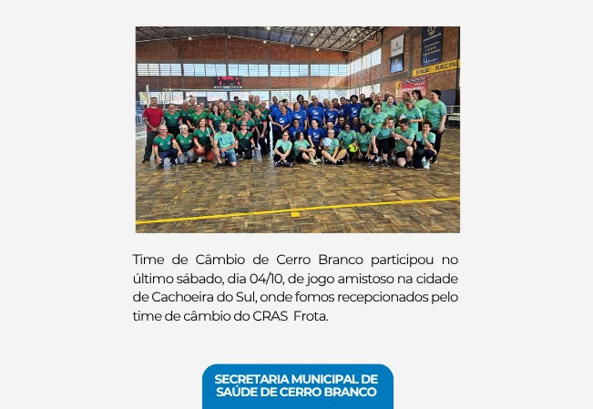 O Time de Câmbio de Cerro Branco esteve em quadra no último sábado, dia 04 de outubro, participando de um jogo amistoso na cidade vizinha de Cachoeira do Sul. A iniciativa reforça a importância da integração social e da prática esportiva para a qualidade de vida da melhor idade do município.