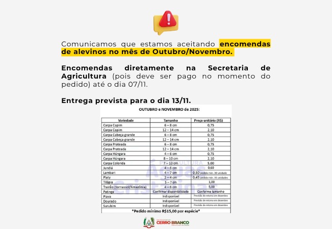 A Secretaria de Agricultura de Cerro Branco anuncia que está aceitando encomenda de alevinos, durante os meses de Outubro e Novembro de 2025.