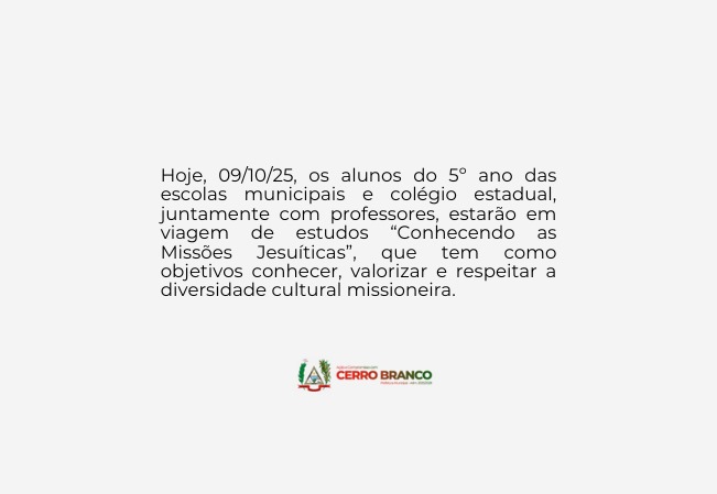 Os alunos do 5º ano das escolas municipais e do Colégio EstadualCerro Branco, acompanhados por seus professores, realizaram nesta quinta-feira (09/10/25) uma importante viagem de estudos com foco no patrimônio histórico-cultural na região das Missões Jesuíticas.