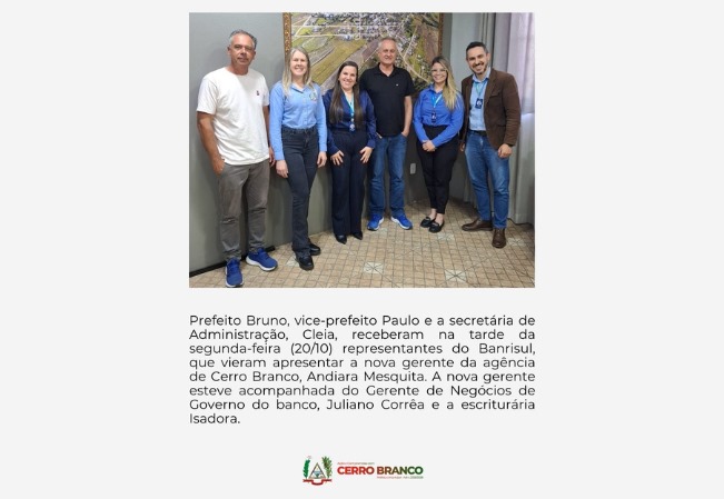 O principal objetivo da visita foi apresentar a nova gerente da agência local de Cerro Branco, Andiara Mesquita. A nova gestora esteve acompanhada do Gerente de Negócios de Governo, Juliano Corrêa, e da escriturária Isadora.