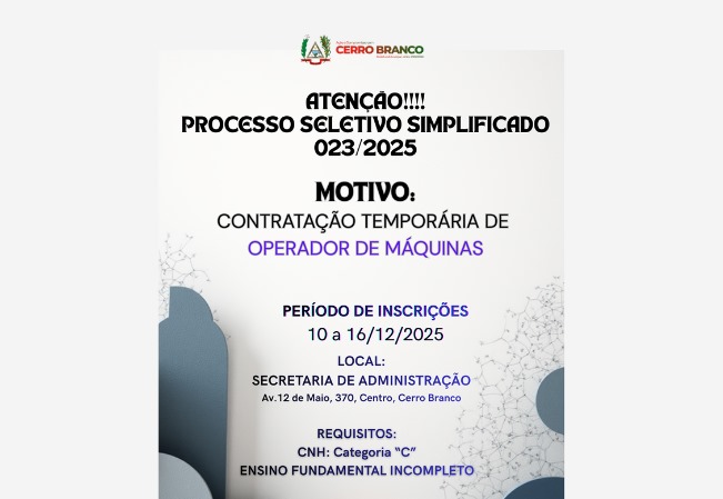 A Prefeitura de Cerro Branco, por meio da Secretaria Municipal de Administração, comunica a abertura das inscrições para o Processo Seletivo Simplificado (PSS) nº 023/2025 destinado contratação temporária para o cargo de Operador de Máquinas. A contratação visa preencher uma vaga de forma imediata e temporária no quadro de servidores municipais.