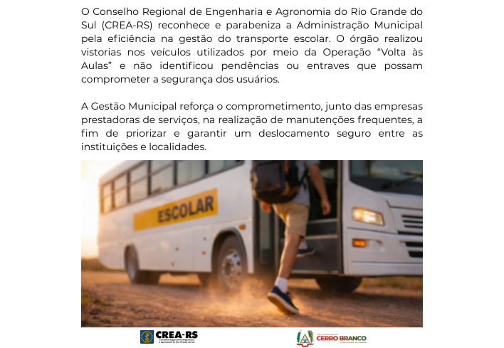 O sistema de transporte escolar de Cerro Branco foi oficialmente reconhecido pelo Conselho Regional de Engenharia e Agronomia do Rio Grande do Sul (CREA-RS) por sua excelência operacional. Após a realização de vistorias técnicas detalhadas, o órgão fiscalizador não encontrou irregularidades, confirmando que os veículos atendem a todos os requisitos de segurança exigidos por lei.