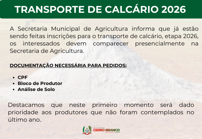 A Prefeitura Municipal de Cerro Branco, por meio da Secretaria de Agricultura, Pecuária e Meio Ambiente, anunciou o início do período de inscrições para o programa de transporte de calcário de 2026. A etapa é fundamental para os agricultores locais que buscam melhorar a produtividade de suas lavouras através da correção da acidez do solo.
