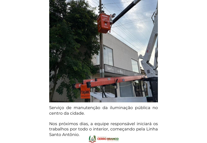 A Prefeitura Municipal de Cerro Branco, por meio da equipe de infraestrutura, está realizando uma força-tarefa para a manutenção e melhoria da iluminação pública na área urbana. Os trabalhos concentram-se, neste momento, no centro da cidade, visando garantir maior segurança e visibilidade para pedestres e motoristas.