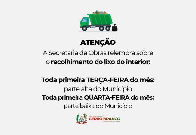 A Secretaria de Obras de Cerro Branco comunica o cronograma de coleta de resíduos nas zonas rurais do município. A medida visa otimizar a logística e garantir que os moradores realizem o descarte de forma adequada.