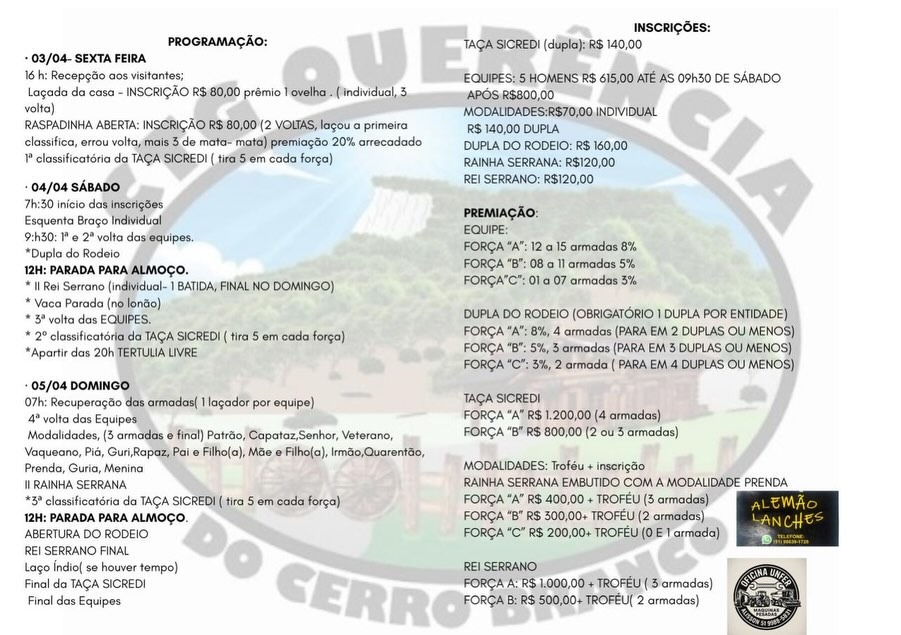 Além das tradicionais disputas em quintetos, que exigem precisão técnica e sintonia entre os competidores, o evento destaca os duelos individuais de Rei e Rainha Serrana, onde a regularidade dos laçadores é premiada com troféus e valores em dinheiro.