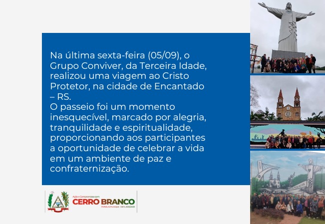 Na última sexta-feira (05.09), o Grupo Conviver da terceira idade realizou uma viagem ao Cristo Protetor, em Encantado -RS, na região do Vale do Taquari. A excursão proporcionou momentos de confraternização e alegria, permitindo que os integrantes celebrassem a vida e renovassem as energias em um local de paz e tranquilidade.
