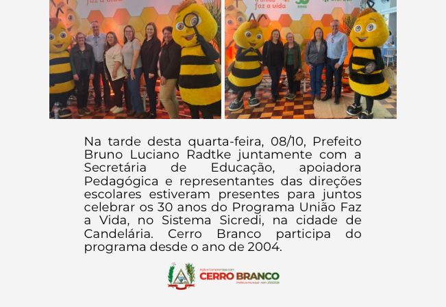 O município de Cerro Branco marcou presença na celebração dos 30 anos do Programa A União Faz a Vida, que promove a educação no Sistema Sicredi. O evento ocorreu na tarde da última quarta-feira, 08 de outubro, na cidade de Candelária.