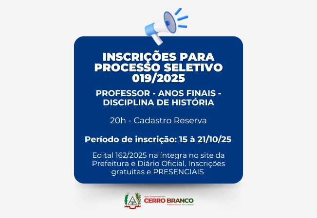 A Prefeitura Municipal de Cerro Branco, por meio da Secretaria de Administração, comunica a abertura de inscrições para o Processo Seletivo Simplificado nº 019/2025, destinado à de Cadastro Reserva para o cargo de Professor – Anos Finais – Disciplina de História.