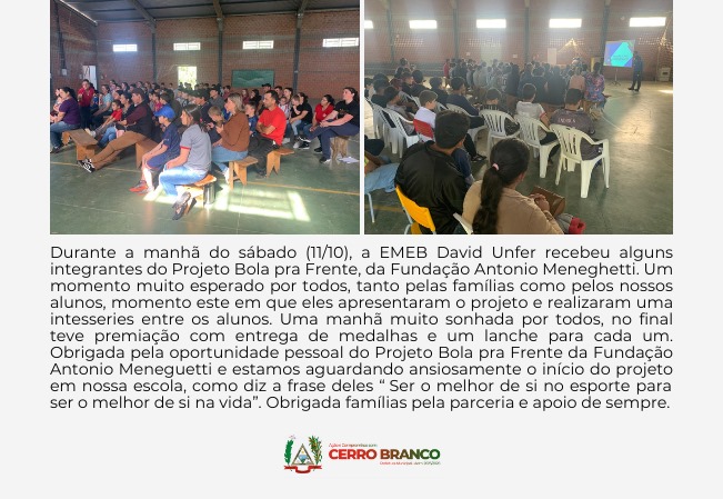 A EMEB David Unfer agradece a oportunidade concedida pela equipe do Projeto Bola pra Frente e da Fundação Antonio Meneghetti. A escola expressa a grande expectativa pelo início oficial do projeto no espaço escolar, que segue o lema de "Ser o melhor de si no esporte para ser o melhor de si na vida", incentivando a excelência e o desenvolvimento integral dos alunos.