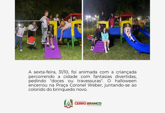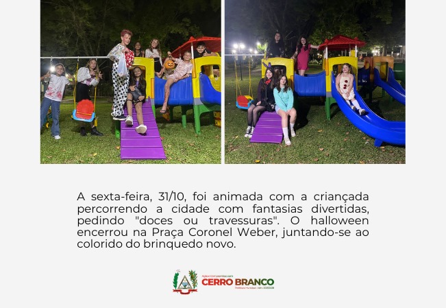 A última sexta-feira, dia 31 de outubro, foi marcada pela comemoração de Halloween em Cerro Branco. A cidade foi tomada pela alegria e criatividade das crianças, que percorreram as ruas com fantasias divertidas pedindo o famoso "doces ou travessuras".