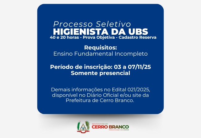 A Prefeitura Municipal de Cerro Branco, por meio da Secretaria Municipal de Administração, comunica a abertura de inscrições para o Processo Seletivo Simplificado nº 021/2025, destinado à Cadastro Reserva para o cargo de Higienista da UBS.