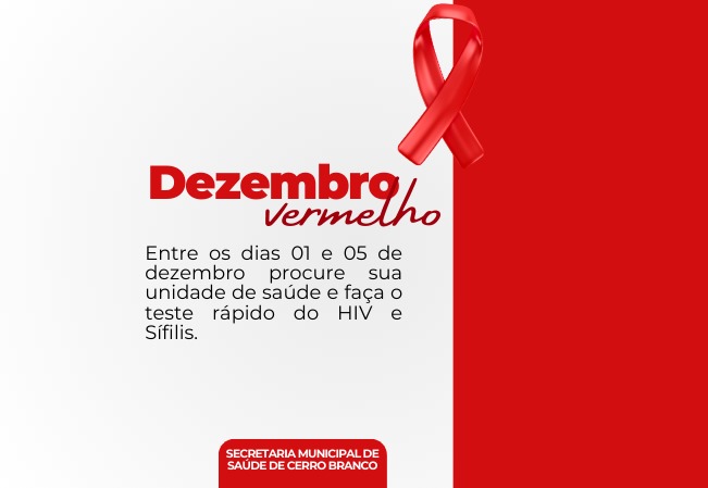 A Secretaria Municipal de Saúde de Cerro Branco adere à campanha nacional Dezembro Vermelho e convoca a população a realizar o teste rápido de detecção do HIV e da Sífilis. A ação, visa o diagnóstico precoce e o início imediato do tratamento, será realizada nas unidades de saúde do município.
