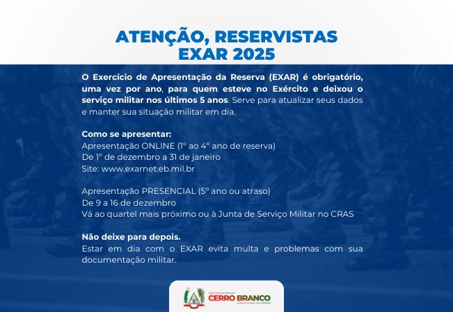 O Exército de Apresentação da Reserva (EXAR) 2025 está com aberto para as modalidades online e presencial. A apresentação é obrigatória para todos os cidadãos que deixaram o serviço militar nos últimos 5 anos, sendo uma etapa crucial para manter a situação militar em dia e atualizar os dados cadastrais junto ao Exército.